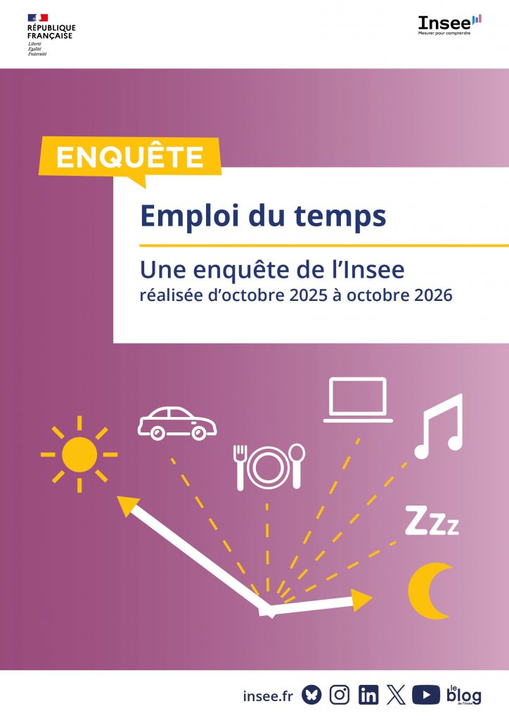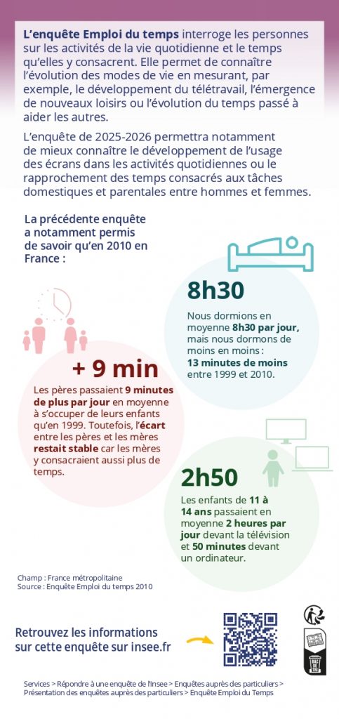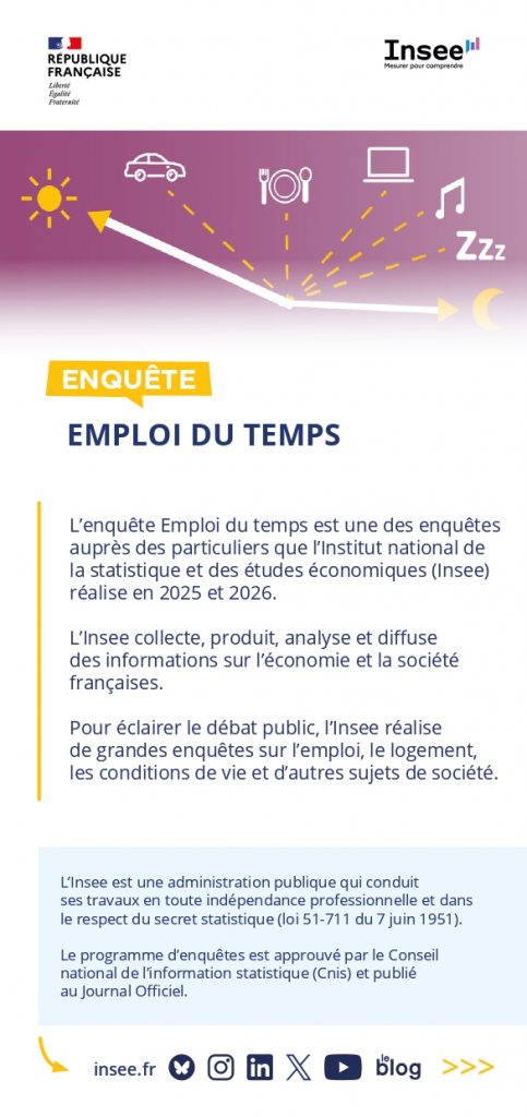L’institut national de la statistique et des études économiques (Insee) réalise au cours des années 2025 et 2026 une enquête sur le thème de l’emploi du temps.